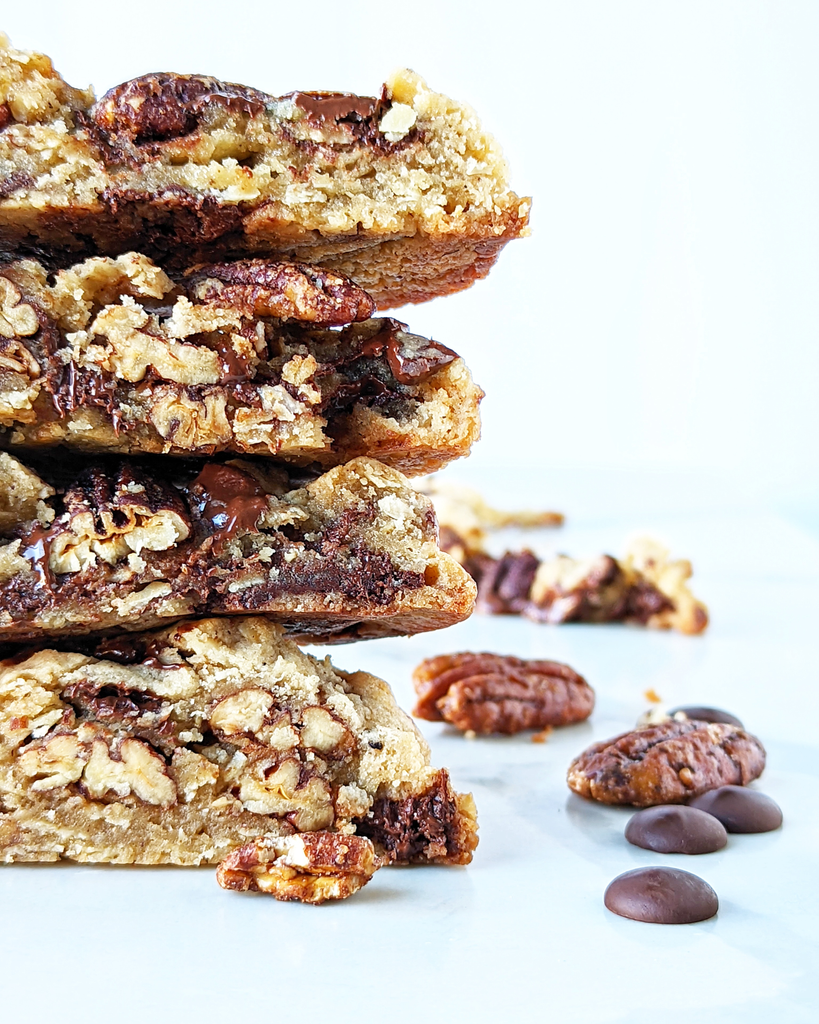 Dark chocolate with a hint of mocha to deepen the cocoa. House-candied pecans with pure Canadian maple—crackly, marbled, unforgettable.